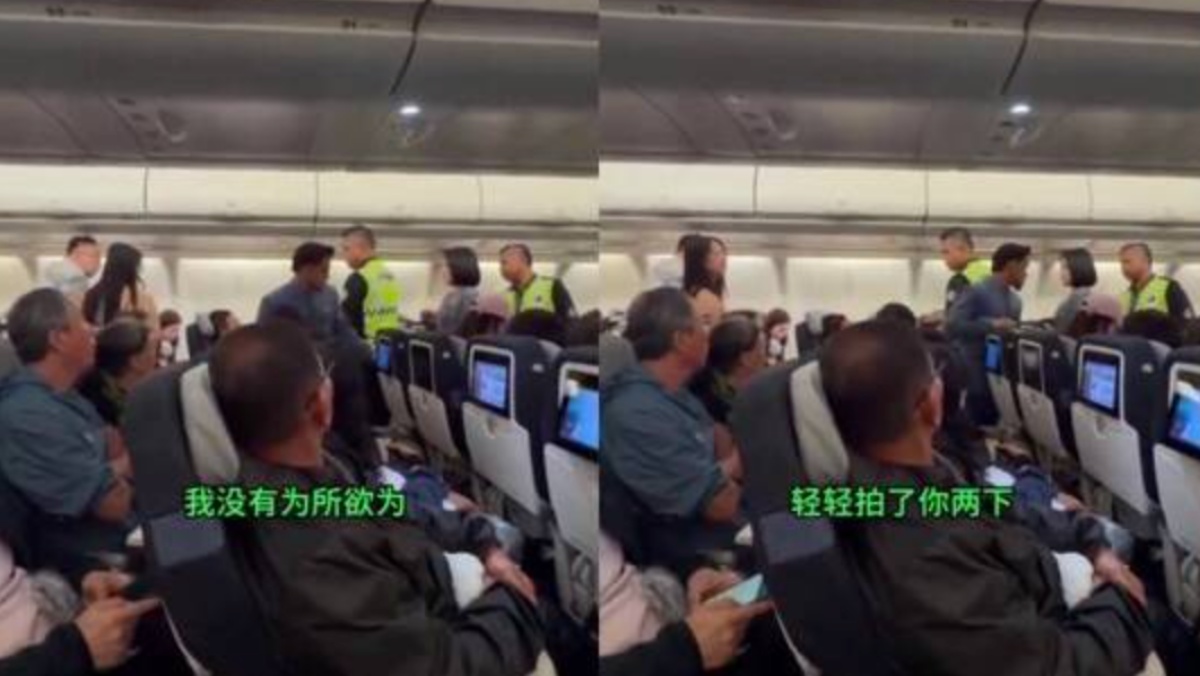 網傳視頻顯示,在一架馬來西亞航班機艙里,一名女空服員在飛機起飛前通報航警,控訴自己被機艙里一名中國男子粗暴拍打。該中國男子辯解說:「這個算動手啊?你說新加坡都不算動手吧?這個算動手嗎?」女空服員表示,算不算動手,交由警察來判定,要求中國男子配合,離開機艙,「機長不允許你上飛機」。但中國男子表現得不配合,仍在辯解說:「那我有導遊啊,我跟團隊啊。」女空服員回懟他:「跟團隊不代表你可以為所欲為。」