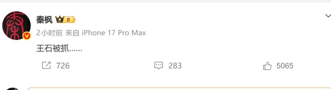 4月12日,知名媒體人,香港衛視綜合台台長秦楓在其微博發佈了一條4字簡訊「王石被抓……」,迅速引發網絡關注,「王石」突然登上了熱搜第一。