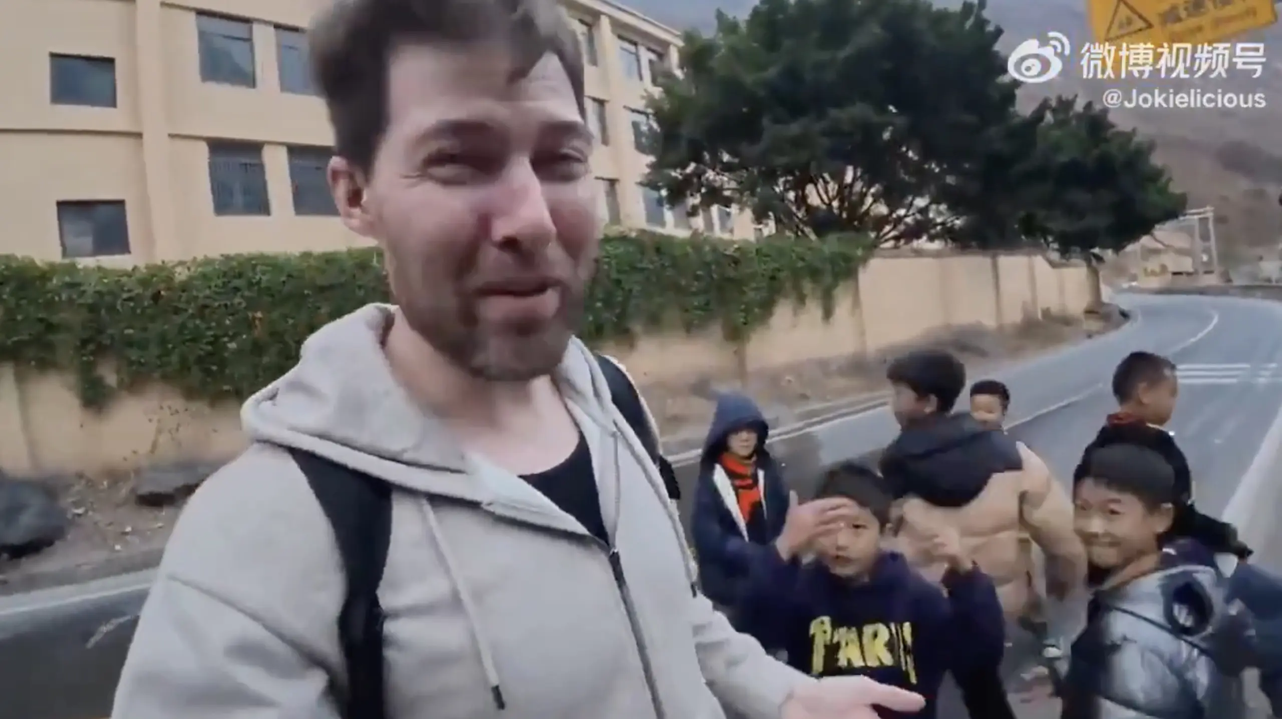 視頻拍攝地點顯示遠處是大山,旁邊疑似一個三層高的學校。