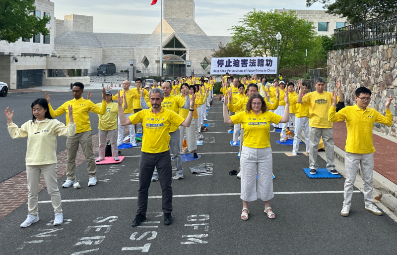 新唐人電視台記者晟言:「周六傍晚,華府部分法輪功學員在中共駐美大使館前集會,紀念1999年「4·25」萬人和平上訪27周年。」