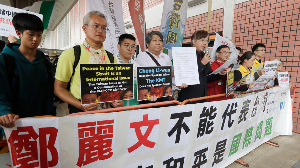 2026年4月7日星期二,在台灣台北松山機場外,抗議者舉着標語,阻攔台灣主要反對黨國民黨主席鄭立文前往中國大陸。