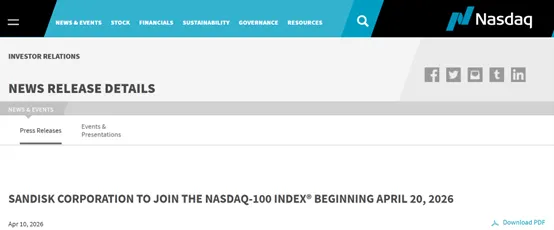 4月10日,納斯達克官網顯示,全球存儲巨頭閃迪公司(Sandisk Corporation)將於4月20日(周一)市場開盤前納入納斯達克100指數,軟件即服務(SaaS)巨頭Atlassian Corp Plc(TEAM)則被剔除。這標誌納斯達克100指數成分股的重大調整。