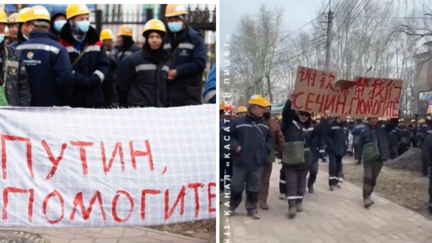 4月13日,網傳視頻顯示,上千工人頭戴工程帽走上街頭,拿着寫有漢語和俄語的橫幅,上面寫着,「謝欽幫幫我們」和「普京幫幫我們」。