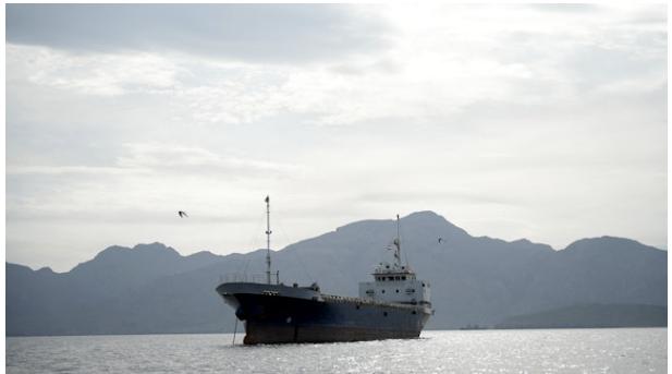2026年4月12日,一艘油輪停靠在阿曼穆桑達姆省(Musandam)外海的霍爾木茲海峽(Strait of Hormuz)。(Reuters)