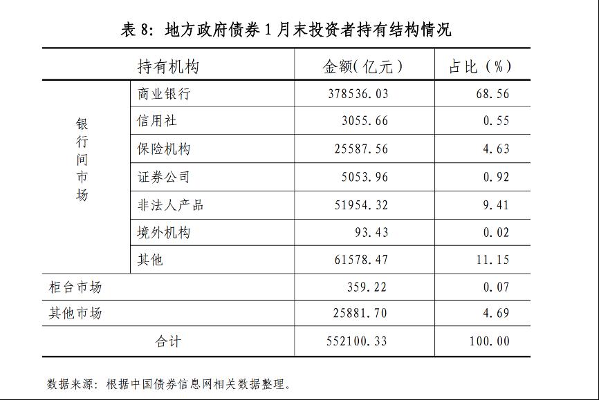 其三,持有地方政府債券的,主要是地方銀行和各類金融機構。很長時間,地方銀行持有地方政府債券的比例高達90%以上,因為地方銀行受地方政府控制。這些年,當局通過多種方式分散風險,持有者結構有所變化,但商業銀行仍佔大頭(68.56%),見下圖。下圖是中共財政部政府債務研究和評估中心「地方政府債券市場報告(2026年1月)」的截圖。