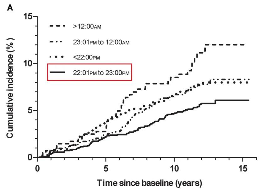 2021年,西安交通大學附屬第一醫院發表在《心血管醫學前沿》上的研究發現,工作日晚上10點至11點就寢的人,心梗發病率最低,具體來看:
