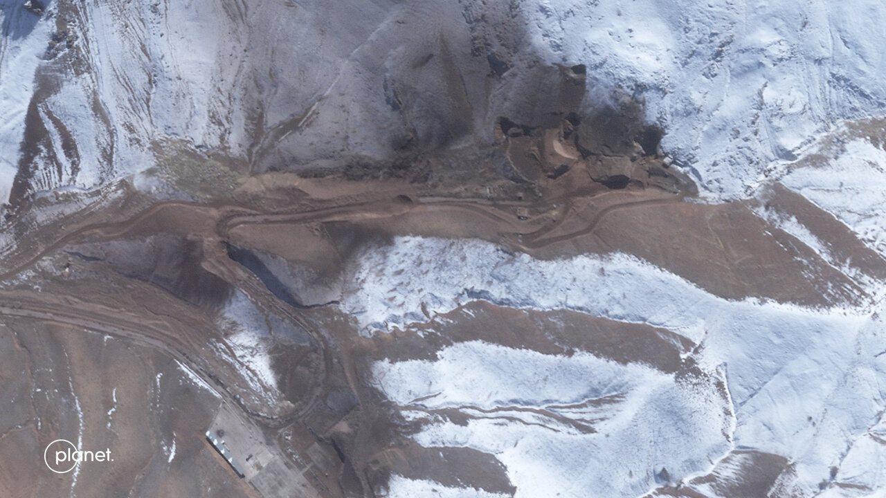 這張由Planet Labs PBC提供的衛星照片顯示,伊朗大不里士北部飛彈基地的隧道入口3月1日出現坍塌情形。(美聯社)