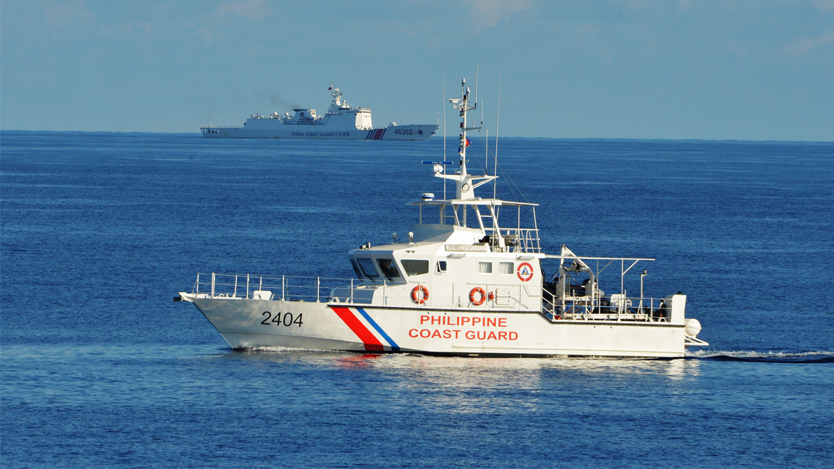 示意圖。2019年5月14日,在黃岩島附近,一艘菲律賓海岸警衛隊的船隻(右)駛過一艘中共海警船。(TED ALJIBE/AFP via Getty Images)