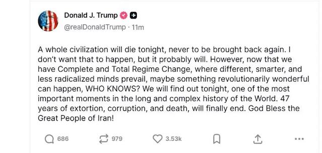 川普在真實社群(Truth Social)的最新貼文,繼續升高對伊朗的施壓。他寫道,「今晚,一整個文明將會消逝,且永不再復返。我不希望這種情況發生,但它很可能會發生。然而,既然我們已經實現了『徹底且全面的政權更迭』,由不同、更聰明且較不激進的人士主導,或許某些具革命性且美好的事物將會發生,誰知道呢?我們今晚就會揭曉,這是世界漫長且複雜的歷史中最重要的時刻之一。長達47年的勒索、腐敗與死亡,終於要結束了。願上帝保佑偉大的伊朗人民!」