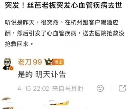據新浪網報導,日前,某社交論壇傳出一則消息聲稱,絲芭老闆突發心血管疾病去世,地點是在杭州跟客戶喝酒應酬,然後引發心血管疾病,送去醫院搶救沒搶救回來。
