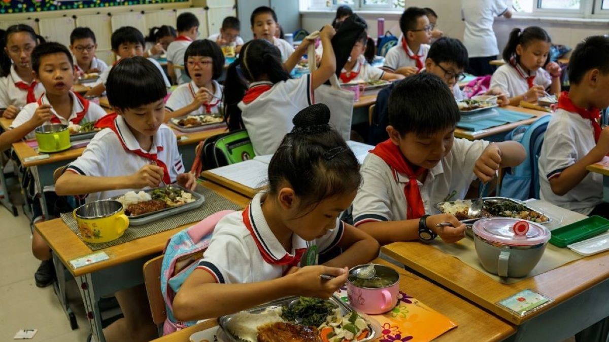 2017年9月27日,上海市某小學的學生們在教室里吃午餐。資料圖與新聞無關。(CHANDAN KHANNA/AFP via Getty Images)