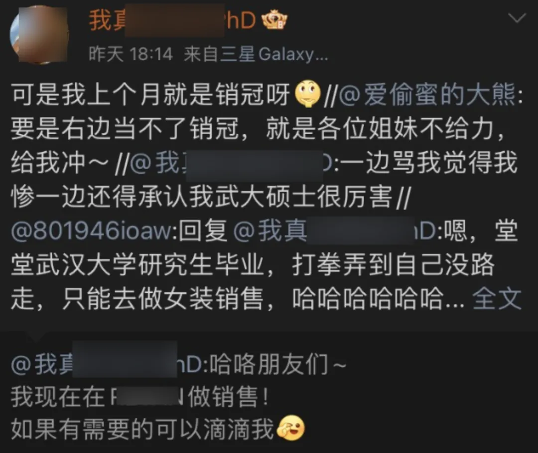 文章中,我寫了備受爭議的「武大圖書館事件」的主角楊某媛,自稱已經找到工作,而且她還對外廣而告之,稱自己在某品牌店當銷售,而且是銷冠,言語之間充滿了嘚瑟之情。