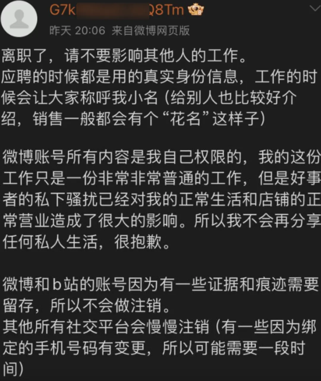 楊某媛表示,自己的工作、生活以及品牌門店都因此事造成了重大影響,所以她不得不辭職,而且她今後不會在社交媒體發任何私人生活的東西,而且她的一些社交平台她也會慢慢註銷掉……
