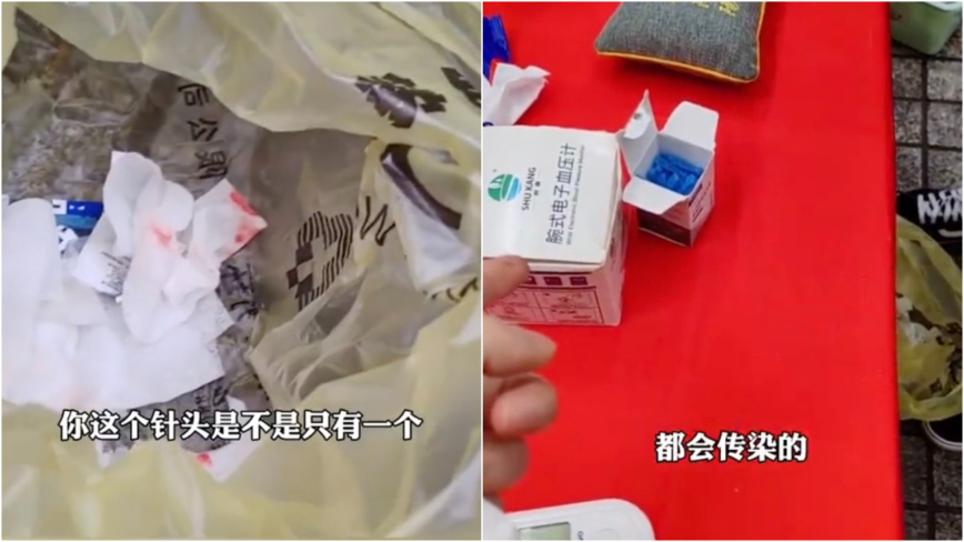 視頻顯示,在診斷台處,有女士詢問採血人員,針頭有沒有換,採血稱「換了」。居民檢查現場的垃圾袋,發現裏面沒有廢棄的針頭,於是質問:「你這個針頭是不是只有一個?你們換下的針頭在哪裏?這麼多人採血,就一個針頭?針頭重複使用,乙肝、丙肝、愛滋(病)都容易傳染的,你說怎麼辦,這是嚴重違規的呀。」