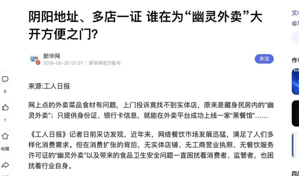 報導提及,早在2019年6月,官媒新華網在一篇《陰陽地址、多店一證誰在為「幽靈外賣」大開方便之門?》(轉自《工人日報》)文章中明確提到,沒有實體店鋪、沒有工商營業執照、沒有餐飲服務許可證的「幽靈外賣」,被大開方便之門。