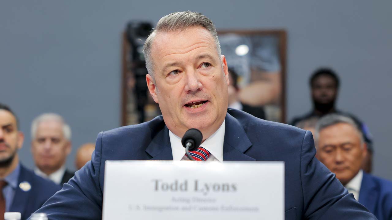 2026年4月16日,移民及海關執法局代理局長萊昂斯(Todd Lyons)於眾議院撥款委員會轄下的國土安全小組委員會聽證會上發言。(Heather Diehl/Getty Images)