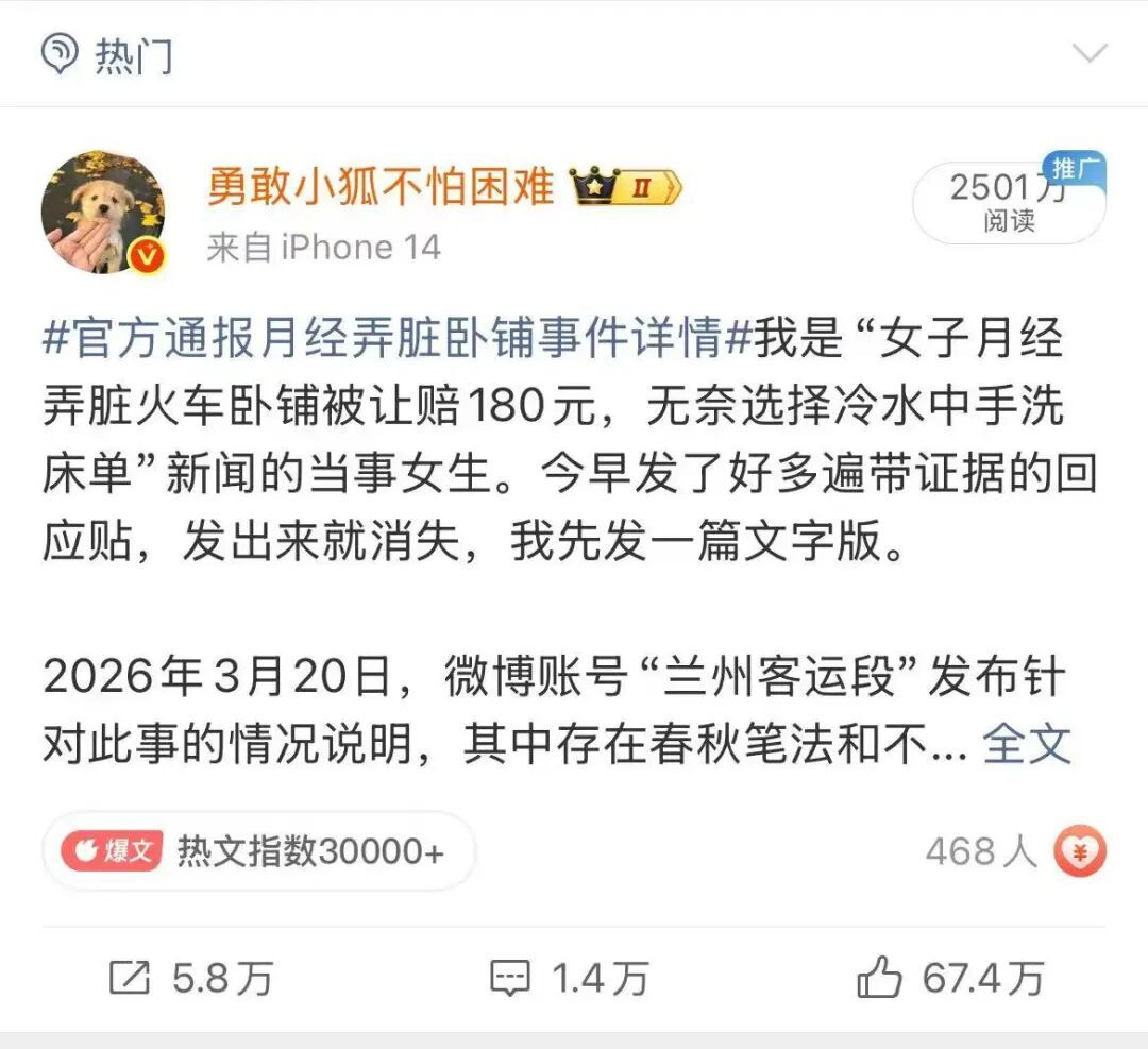 2026年3月,一樁因火車臥鋪上一灘經血引發的爭議,從微博熱搜到法律訴訟,當事人「小狐」(化名)與「蘭鐵」的拉鋸,成為一場關於女性權利、公共服務、以及個人對抗系統的微型抗爭。