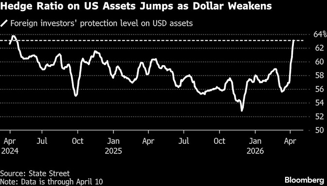 根據道富銀行(State Street Corp.)的數據,投資者已將美元對沖比例提高至兩年來的最高水平。與此同時,在期權市場,對美元的信心有所減弱,相關倉位的看漲程度降至數周以來最低。