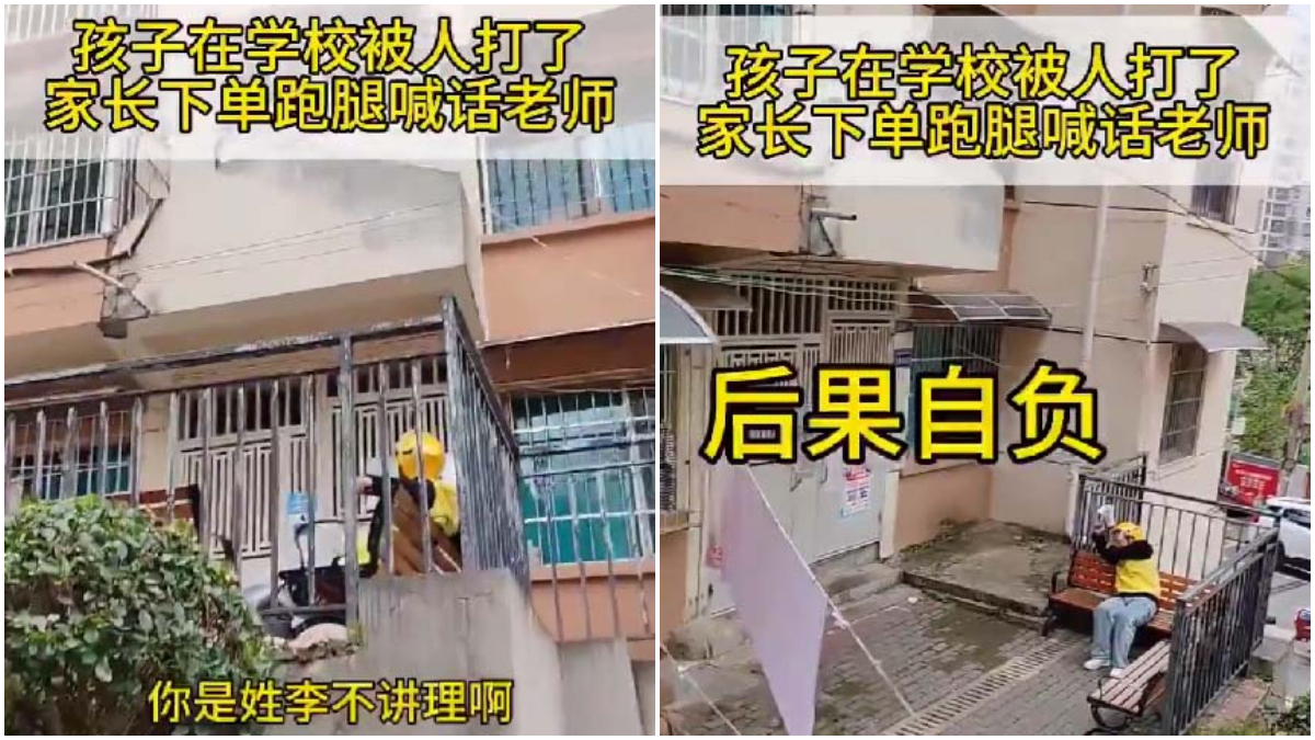 2026年4月,網傳大陸家長下單,讓外賣員喊話孩子老師,怒斥其縱容霸凌。(視頻截圖)