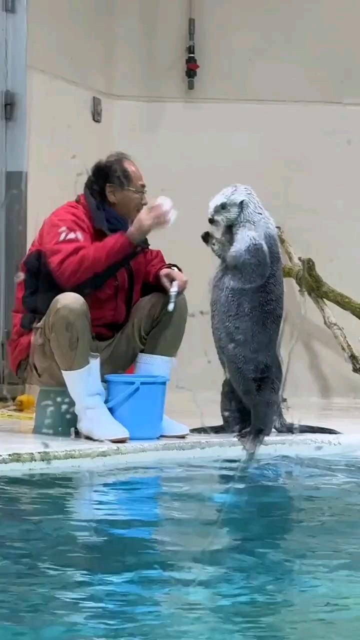 韓國某水族館,下班了,聰明伶俐的水獺寶寶幫爺爺收拾玩具,爺爺拿出了冰塊獎勵給它們冰塊。