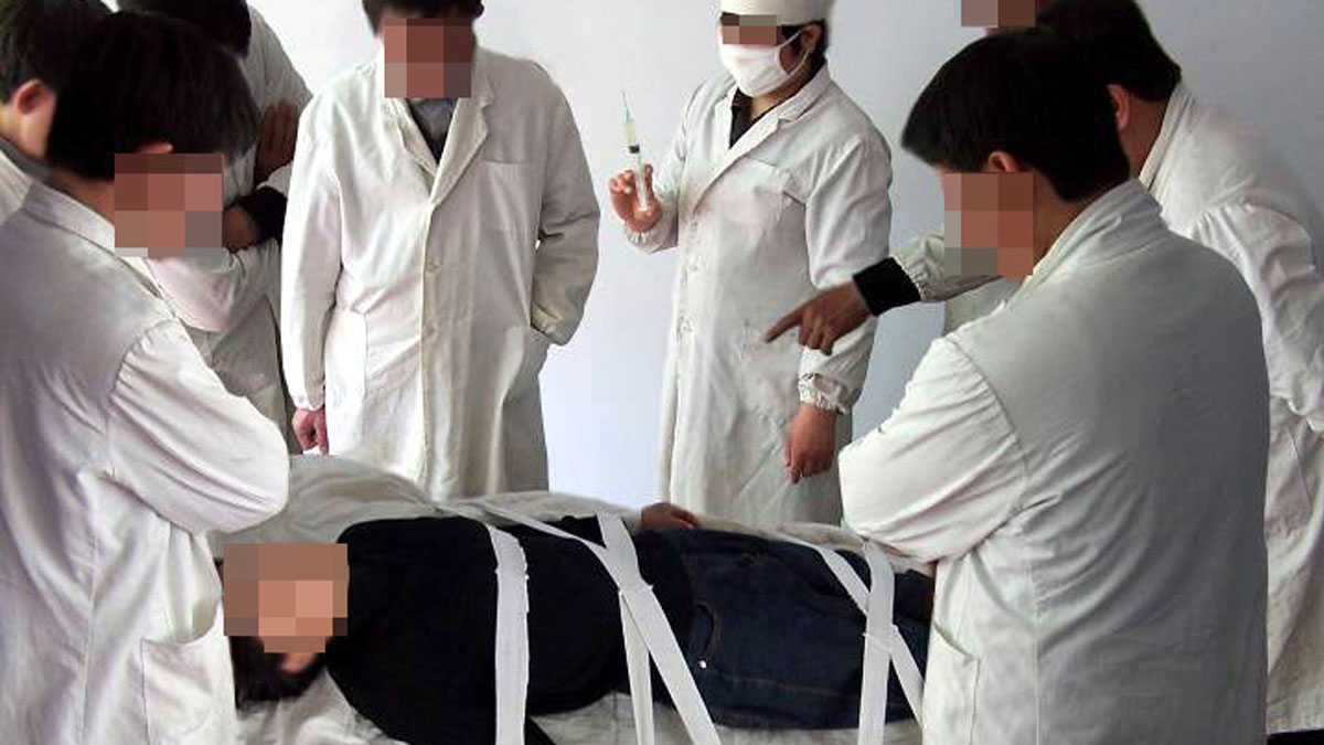 中國法輪功學員受迫害酷刑演示:打毒針(注射不明藥物)。(法輪大法明慧網)