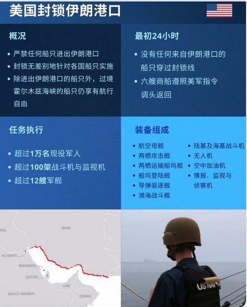 美軍只對進出伊朗港口的船隻實施封鎖,其它船隻則不受影響。