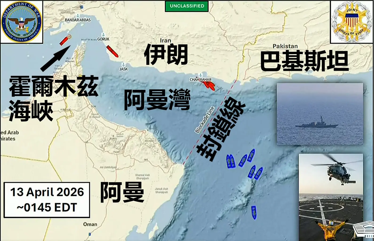 2026年4月13日,美軍在阿曼灣出口劃定封鎖線,開始對進出伊朗船隻實施海上封鎖。(美國戰爭部視頻截圖/大紀元製圖)
