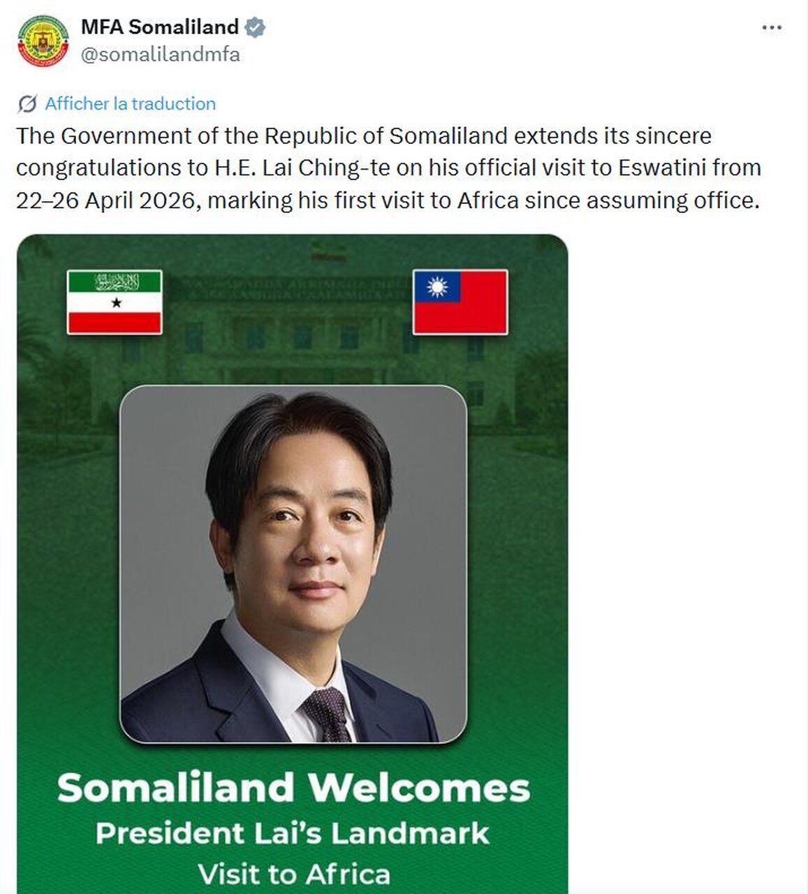 索馬里蘭貼文表示,索馬里蘭共和國政府誠摯祝賀賴清德總統閣下於2026年4月22日至26日正式訪問斯威士蘭,此行是賴總統上任以來首次訪問非洲。」