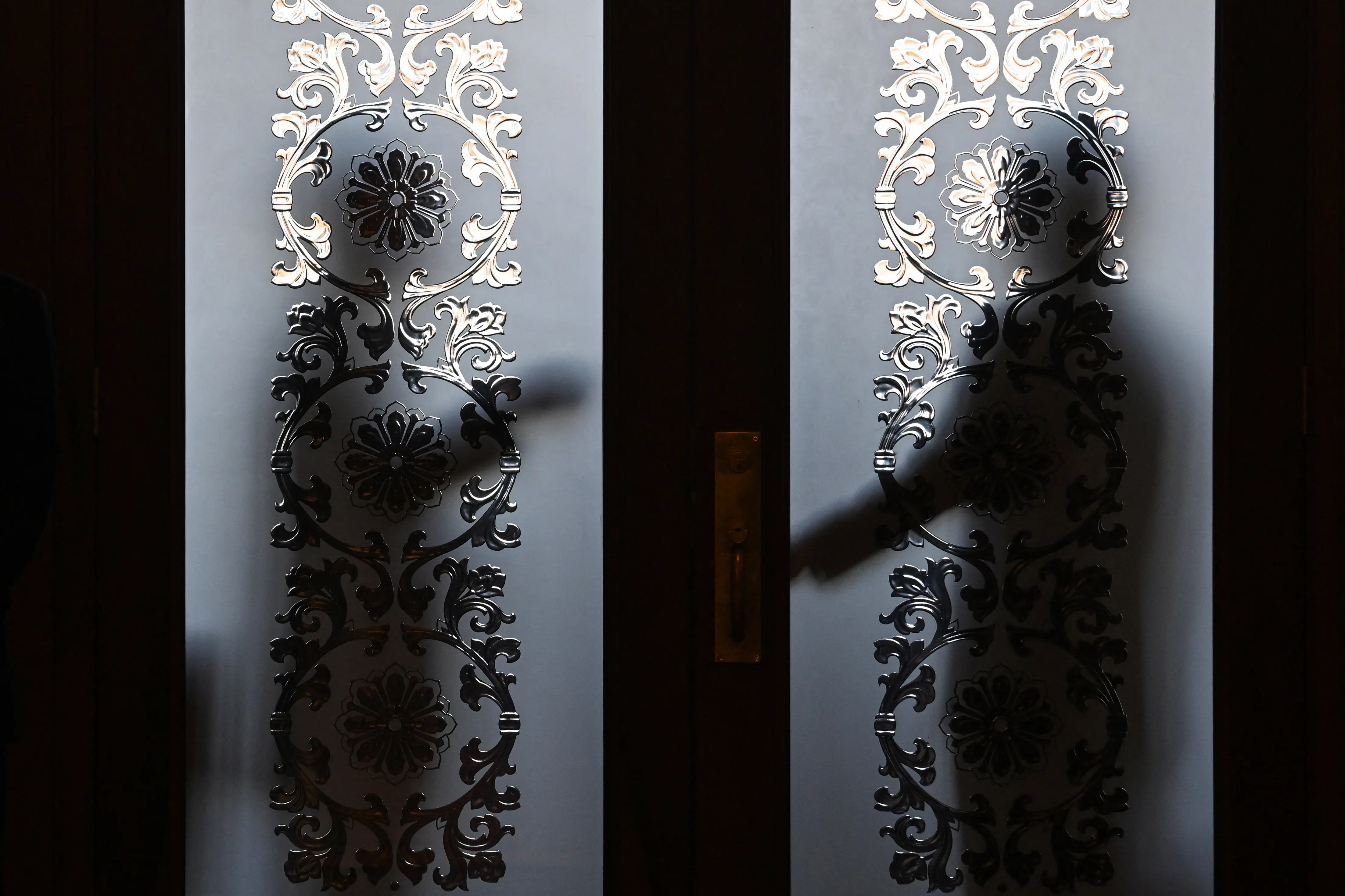 示意圖。2024年3月6日,北京全國人大期間,保安人員站在人民大會堂西藏廳外的玻璃門後面。(GREG BAKER/AFP via Getty Images)