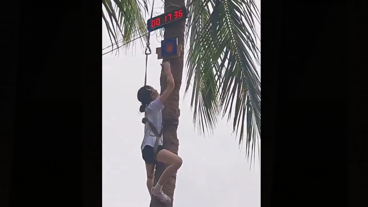 網傳的視頻顯示,這名16歲的女生來到椰樹前,隨着一聲令下,她開始攀爬。她手腳並用,雙腿緊緊夾住樹身,動作敏捷、乾脆利落,從地面到樹頂,用了17秒多。現場同學不斷高喊「加油!加油!」(點擊觀看相關視頻)而在男子組比賽中,一名男生不到10秒就登頂。