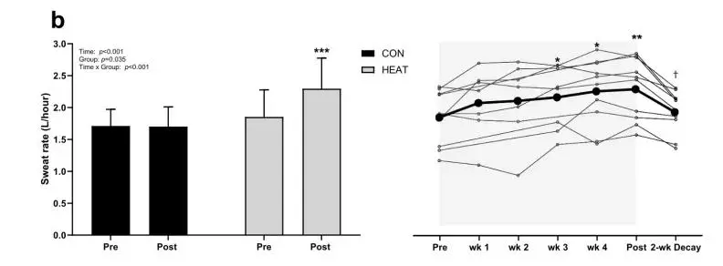 一項針對20名精英自行車運動員的熱適應研究[7]發現,經過5周的訓練,運動員的出汗率平均增加了0.44升/小時,同時汗液鈉濃度顯著下降,運動耐熱性和運動表現均得到提升。這說明汗腺分泌增強並非「流失能量」,而是人體通過高效出汗來快速散熱,並且通過降低汗液鹽分來節約電解質。