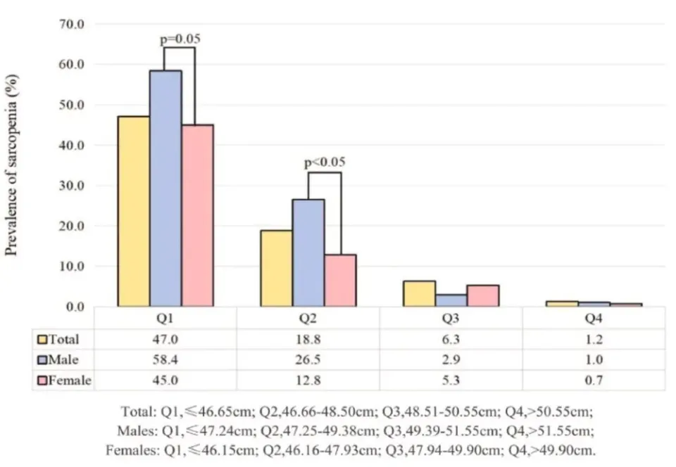 根據大腿周長分組的肌肉減少症患病率