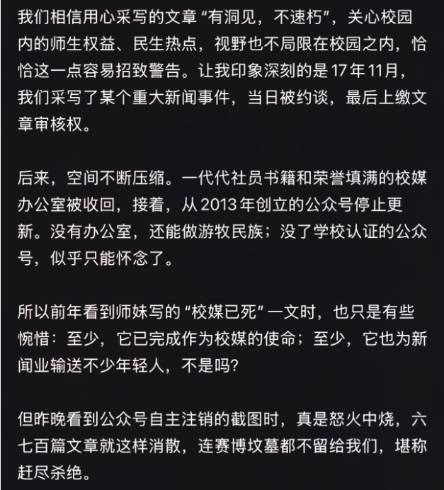 我們相信用心采寫的文章"有洞見,不速朽",關心校園內的師生權益、民生熱點,視野也不局限在校園之內,恰恰這一點容易招致警告。