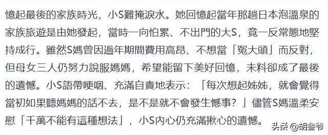 反覆念叨自己太后悔了,後悔到裂開,每次一閉眼就會想,如果當初聽媽媽的話,不發起這場旅行,大S是不是就不會出事。