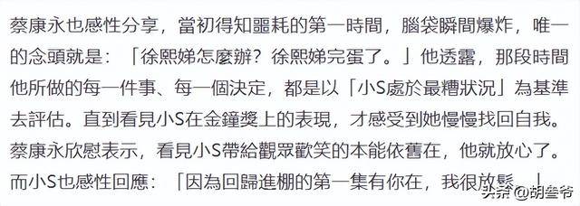 直到看到小S在金鐘獎上的表現,才感覺到她慢慢找回自己,知道她天生能帶給別人快樂的本事還在,才算真正放心。