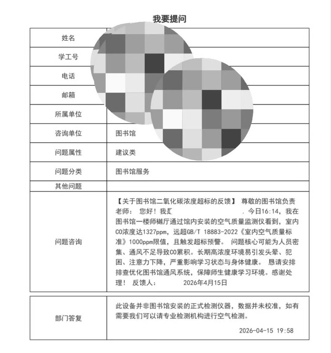 該學生提出,圖書館人員密集,導致二氧化碳超標,長期的高濃度環境容易引發頭暈、犯困、注意力下降,嚴重影響學習狀態和身體健康,因此懇請圖學校排查和優化圖書館的通風系統,保障師生健康和學習環境。