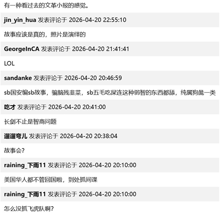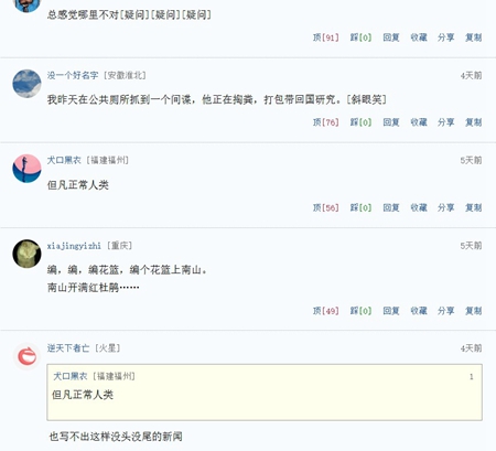 上述消息引發網民一片嘲諷。不少中國網民紛紛表示,「總感覺哪裏不對。」「我昨天在公共廁所抓到一個間諜,他正在掏糞,打包帶回國研究。」「但凡正常人類也寫不出這樣沒頭沒尾的新聞。」