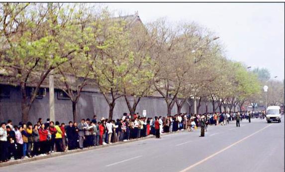 夏勝春:「不到9點吧,我們走到西安門大街已經走不動了,府右街那邊人已經排滿了,人已經排到西安門大街這邊來了,我們就在後邊排上。我算是年輕的站在最前面一排,那天我基本上一直站着,直到晚上9點。 法輪功學員們在行人路上排了三行隊,給行人路留出來一半。周圍的學員有北京的,也有河北來的。從穿戴來看,階層行業不同,但大家沒有口號,沒有喧譁,平靜祥和。」