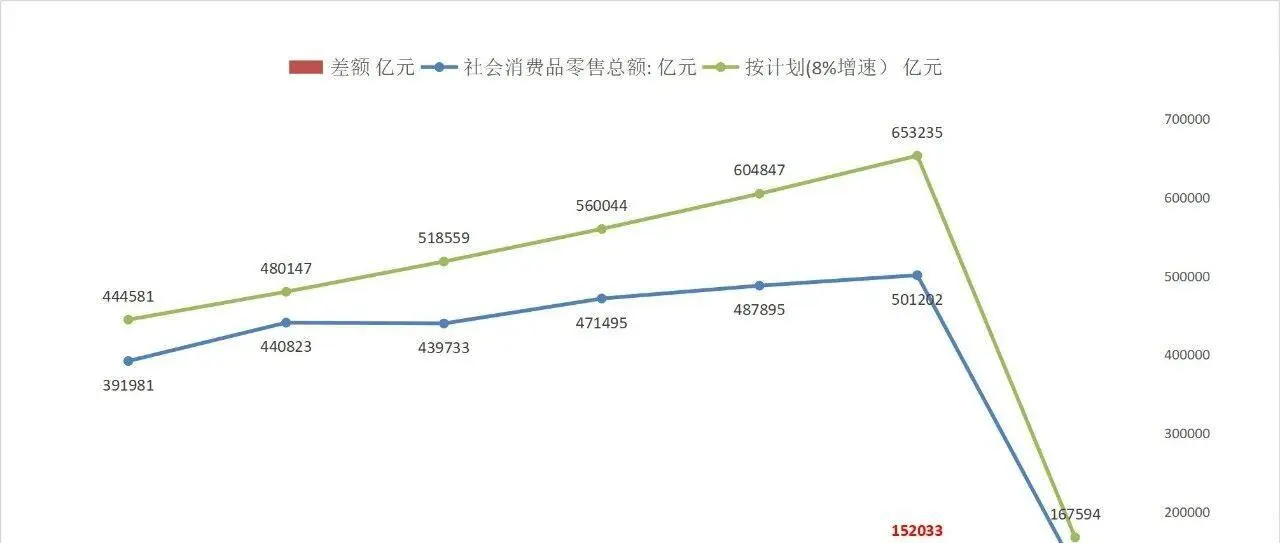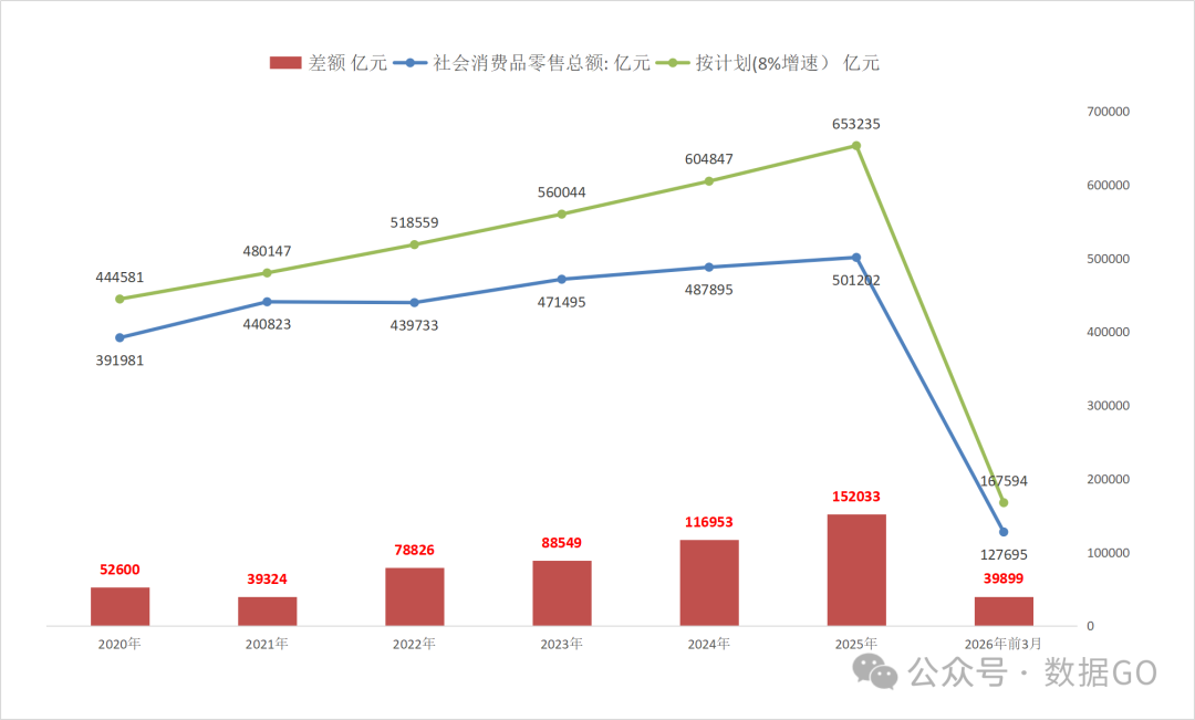 2020年之前,歷史上消費增速從沒低於8%,如果按8%的年增速測算,今年前3月消費額應該在16.76萬億,實際上比它差了3.99萬億。從2020年至2025年的這6年計差額是52.83萬億,加上2026年前3月的差額,合計差額56.82萬億,這個差額可能是導致經濟低迷的原因之一。