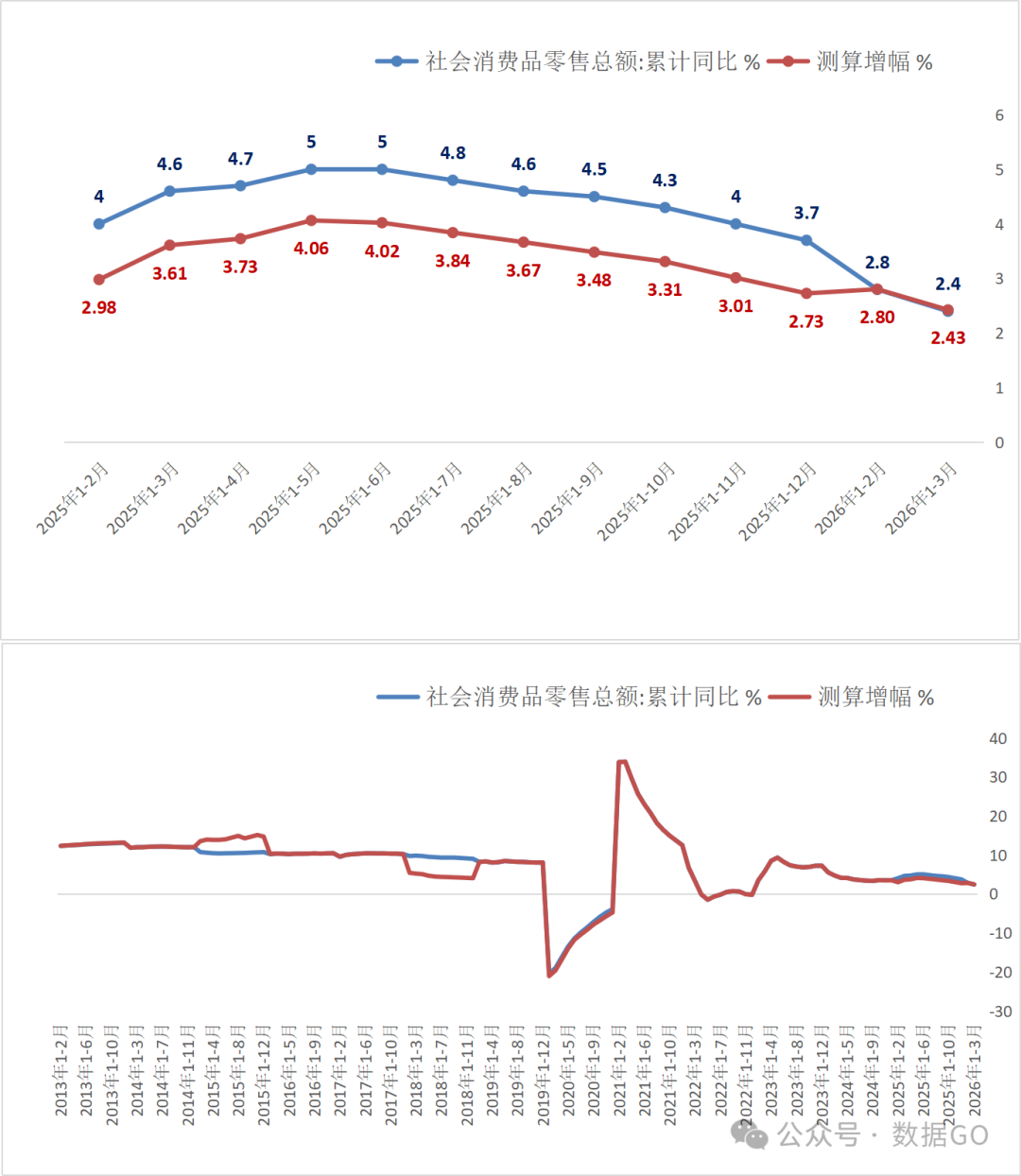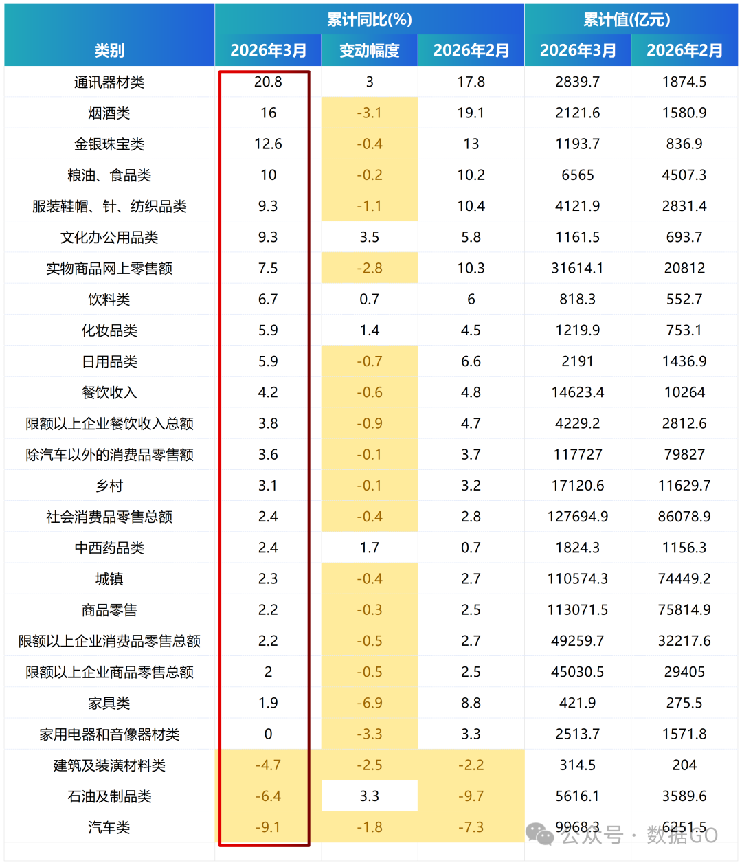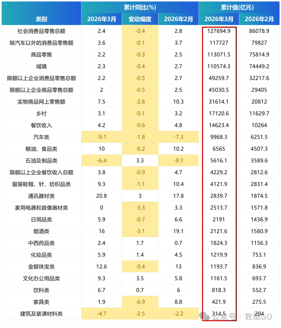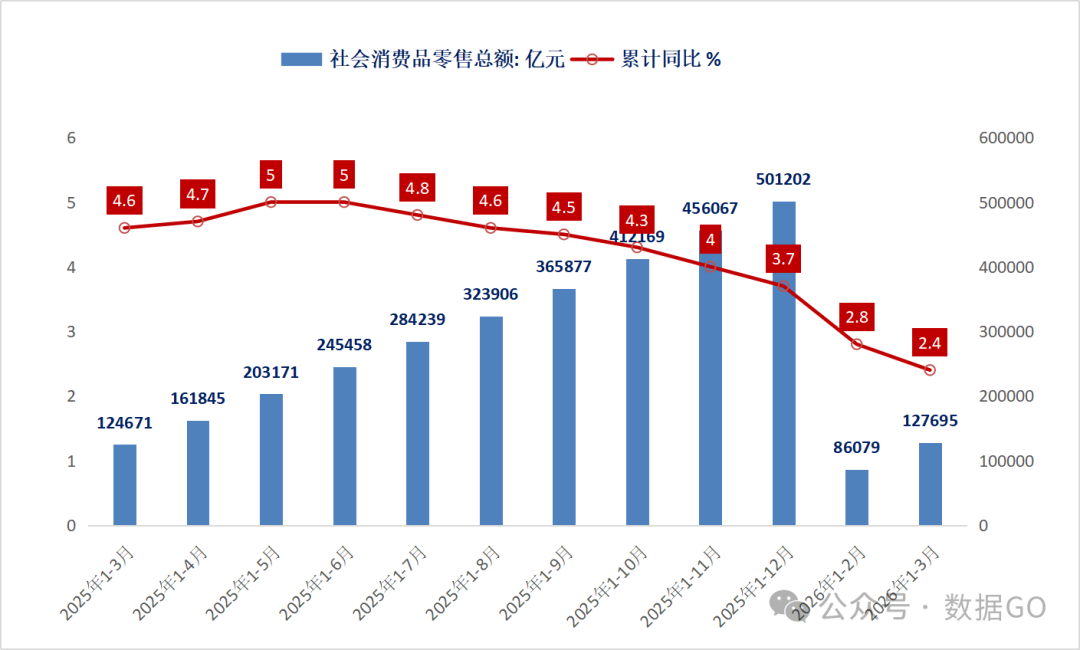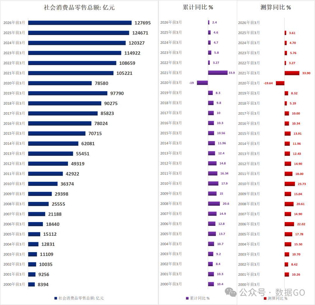 根據統計局數據,2026年1-3月份,社會消費品零售總額12.77萬億元,同比增長2.4%,增幅低於前2月的2.8%,增速連續8個月萎縮,根據絕對值測算增幅是2.43%,與公佈增幅基本一致。