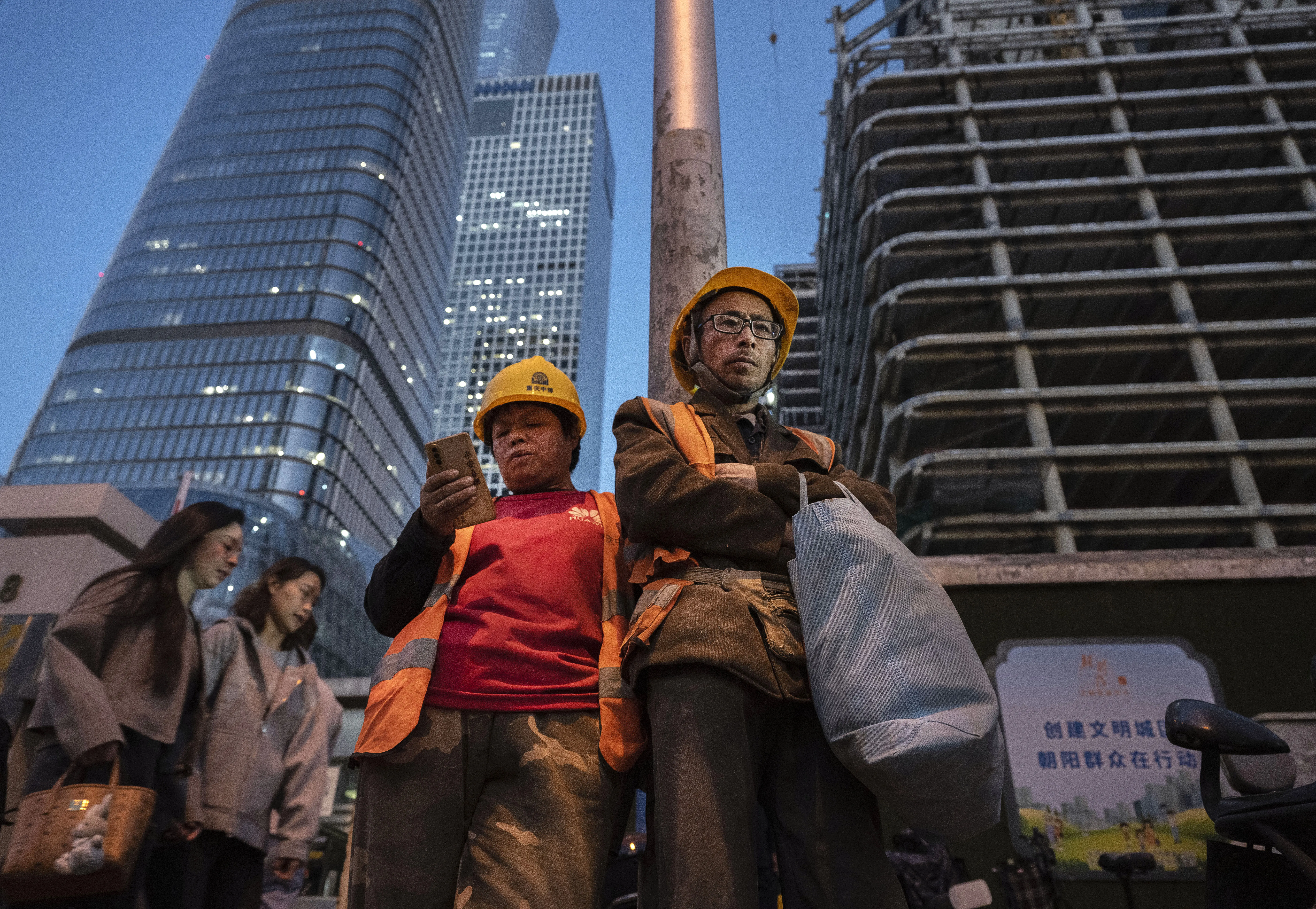 中國經濟下行,內需不振。圖為2024年10月15日,北京中央商務區新辦公樓施工現場,建築工人下班後在工地外等候。