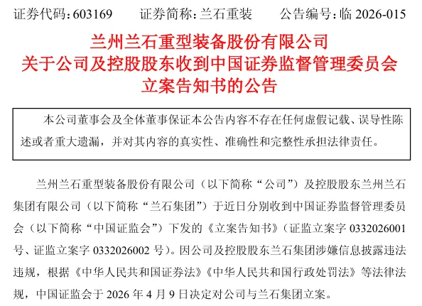 蘭石重裝(603169)亦發佈公告稱,因公司及控股股東蘭石集團涉嫌信息披露違法違規,根據《中華人民共和國證券法》《中華人民共和國行政處罰法》等法律法規,中國證監會於2026年4月9日決定對公司與蘭石集團立案。