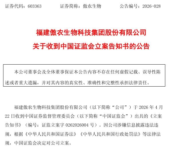 傲農生物(603363)公告稱,公司於4月22日收到中國證監會出具的《立案告知書》。因公司涉嫌信息披露違法違規,根據《中華人民共和國證券法》《中華人民共和國行政處罰法》等法律法規,中國證監會決定對公司立案。立案調查期間,公司將積極配合中國證監會的調查工作,並嚴格按照相關法律法規及監管要求履行信息披露義務。