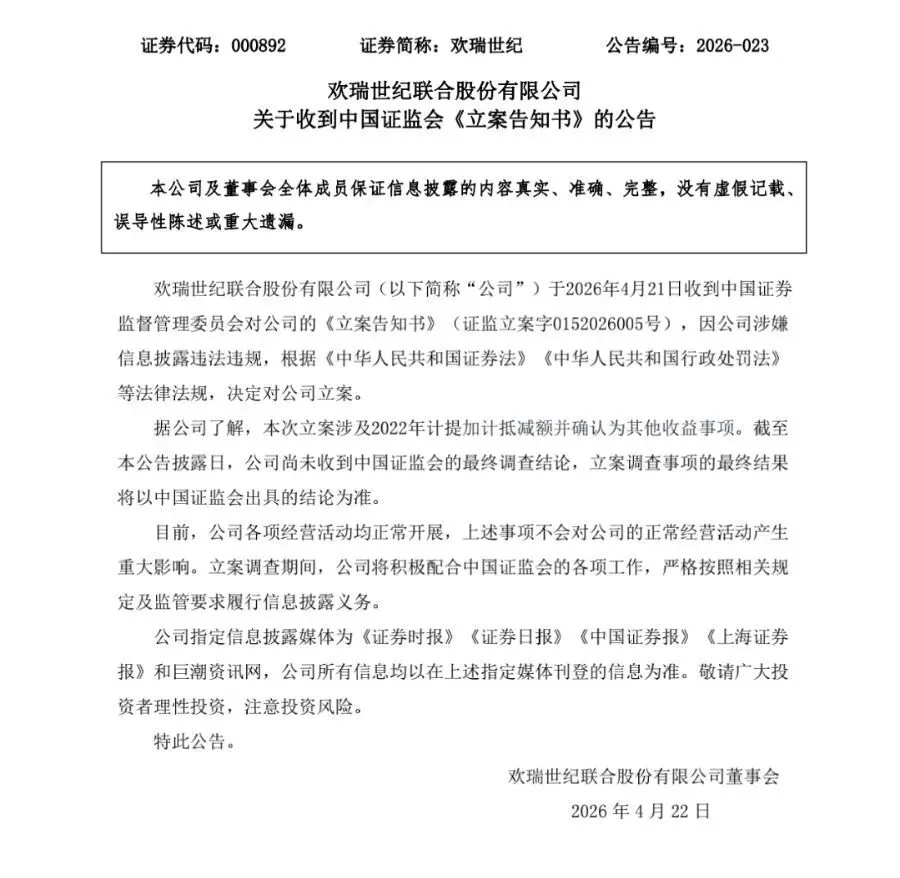 歡瑞世紀(000892)披露公告稱,公司於4月21日收到證監會對公司的《立案告知書》,因公司涉嫌信息披露違法違規,決定對公司立案。
