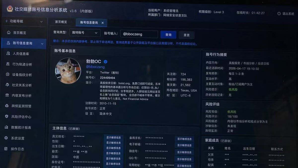 大陸網絡工程師牟先生表示,這類系統最可怕的地方,不是單一信息,而是它能長期記錄用戶行為,尤其針對海外社交媒體賬戶進行持續跟蹤。無論這張圖是真是假,它所體現的方向是明確的,就是把網絡身份與現實身份打通。