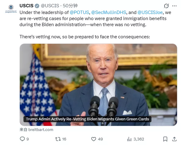 這一表態標誌着移民局的重大轉向!在拜登時期,移民局充當一個福利機構的角色,審查相當輕鬆。而在川普時代,移民局已經轉型為執法機構的角色,其下屬的「欺詐檢測和國家安全局」(Fraud Detection and National Security Directorate)正在成為最重要的機構。