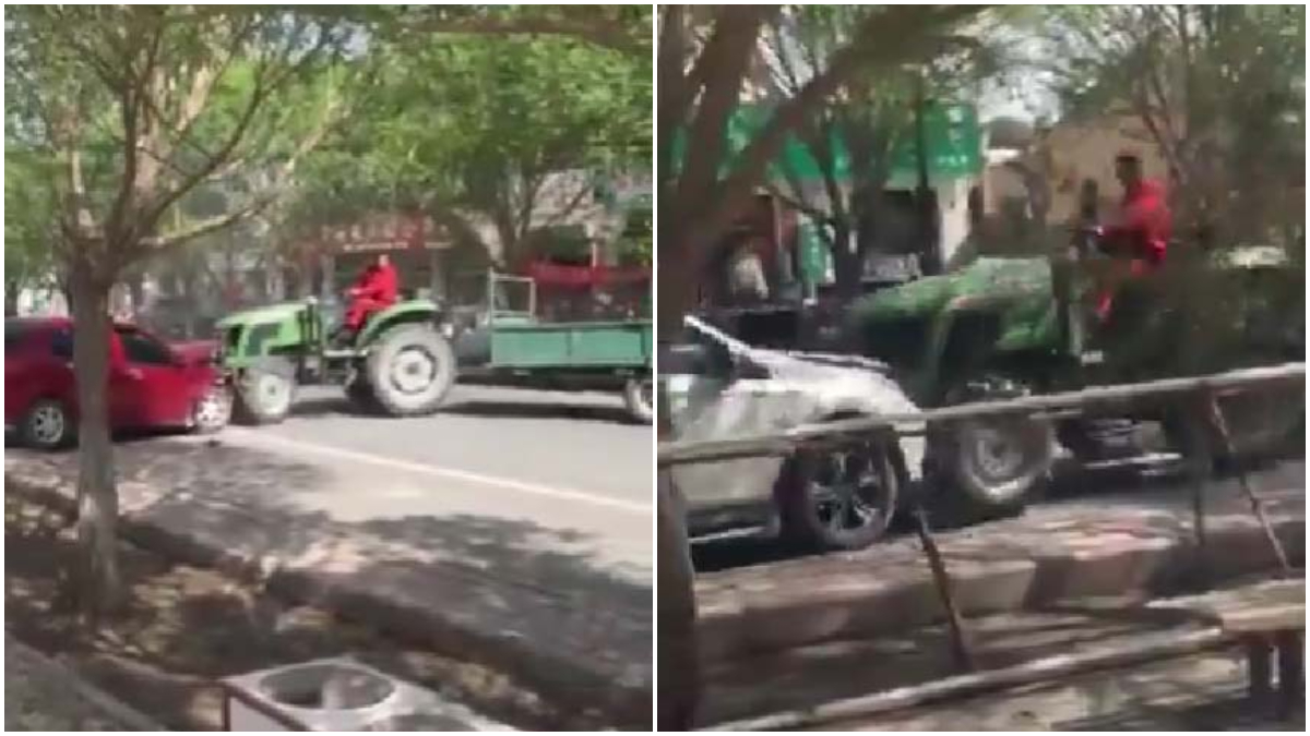 2026年4月,網傳甘肅酒泉市一名紅衣男子開着拖拉機一路追撞車輛和行人。(視頻截圖)