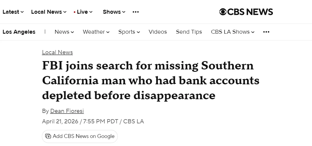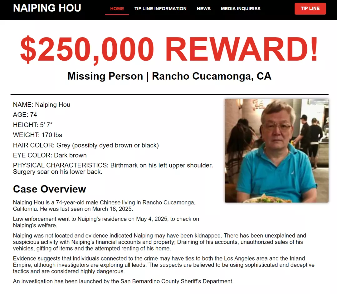 4月21日,美國聯邦調查局(FBI)正式介入調查一起加州華人老人離奇失蹤案,74歲的侯乃平(Nai PingHou)自2025年3月失聯以來近一年毫無音訊,而在其失蹤期間卻有人持續使用其手機與外界聯繫、其銀行賬戶資金被迅速轉移、住所也被清空並重新粉刷,這一連串異常情況使案件至今仍未有定論。