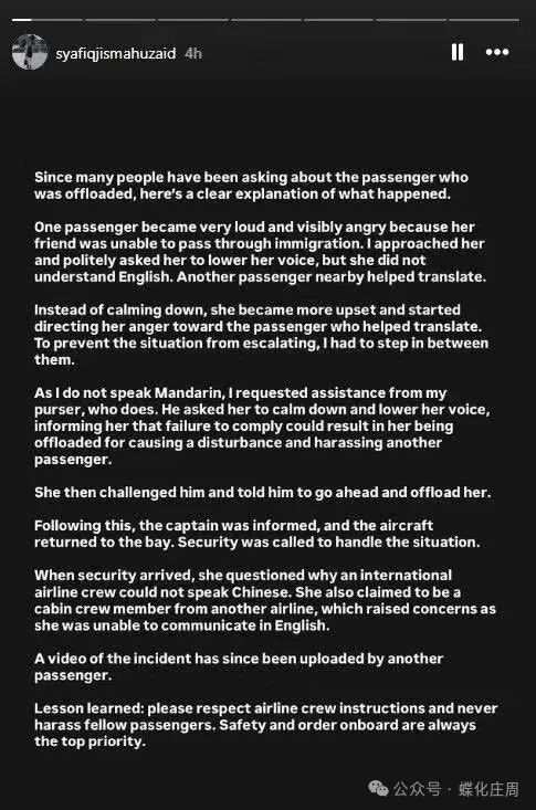 所以,航班上的空少(皮膚略顯黝黑,應該是馬來人)提醒她降低音量,並且告知她,按法規,這個時候應該關機。