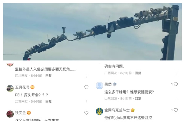對此,網友嘲諷道,「不是十幾個,是幾十個。」「遠看貓頭鷹一排,近看一排攝像頭!密密麻麻!」「杆子:我好辛苦啊。」「我都怕杆子被壓垮了,這應該是貪吃蛇搞的。」「看到這樣,反應老百姓真難。」「不要驚奇,這是監控開會。」「不管多少攝像頭,該找不到的還是找不到,該突然壞的還是突然壞。」「他們的小心臟離不開這些監控。」